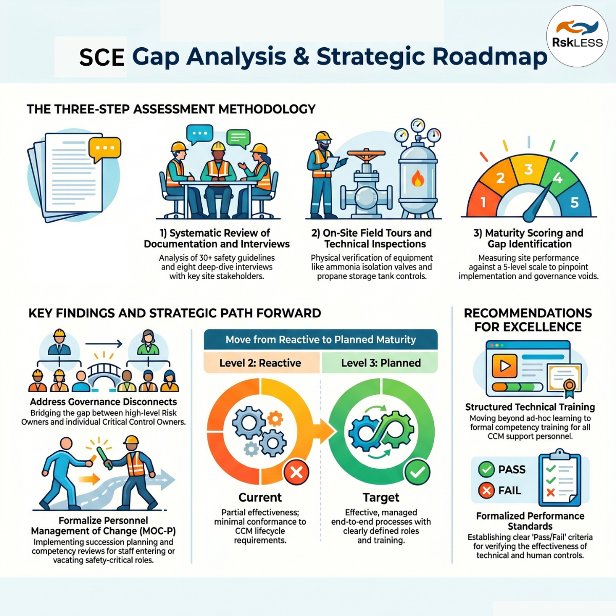 RskLess approaches gap analysis as more than just a documentation review. It is a systematic assessment of the people, processes, and technology required to keep a facility safe.